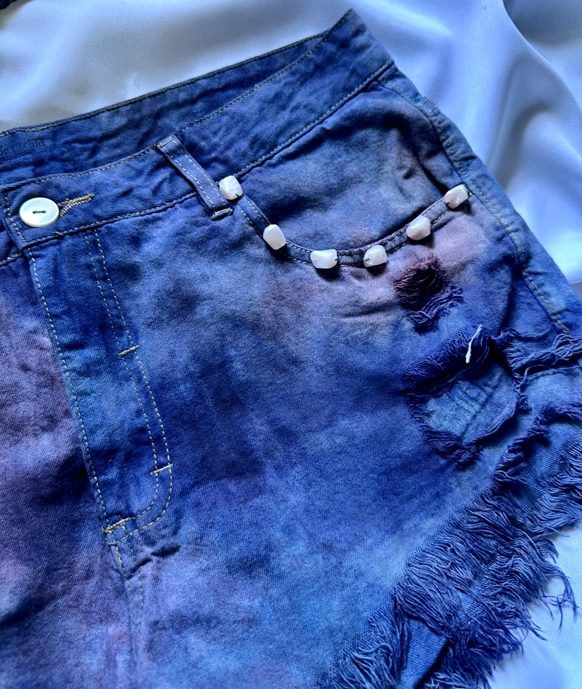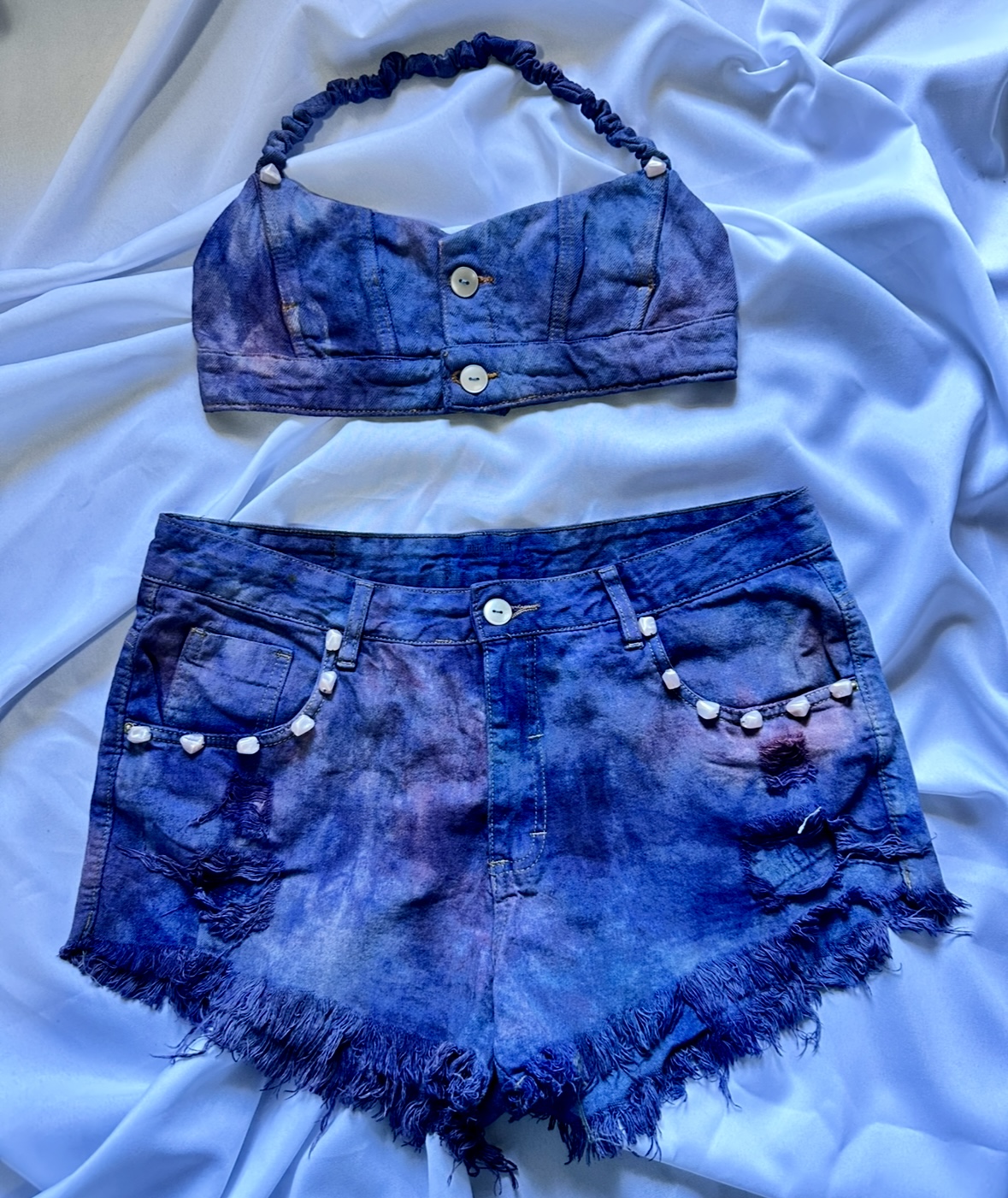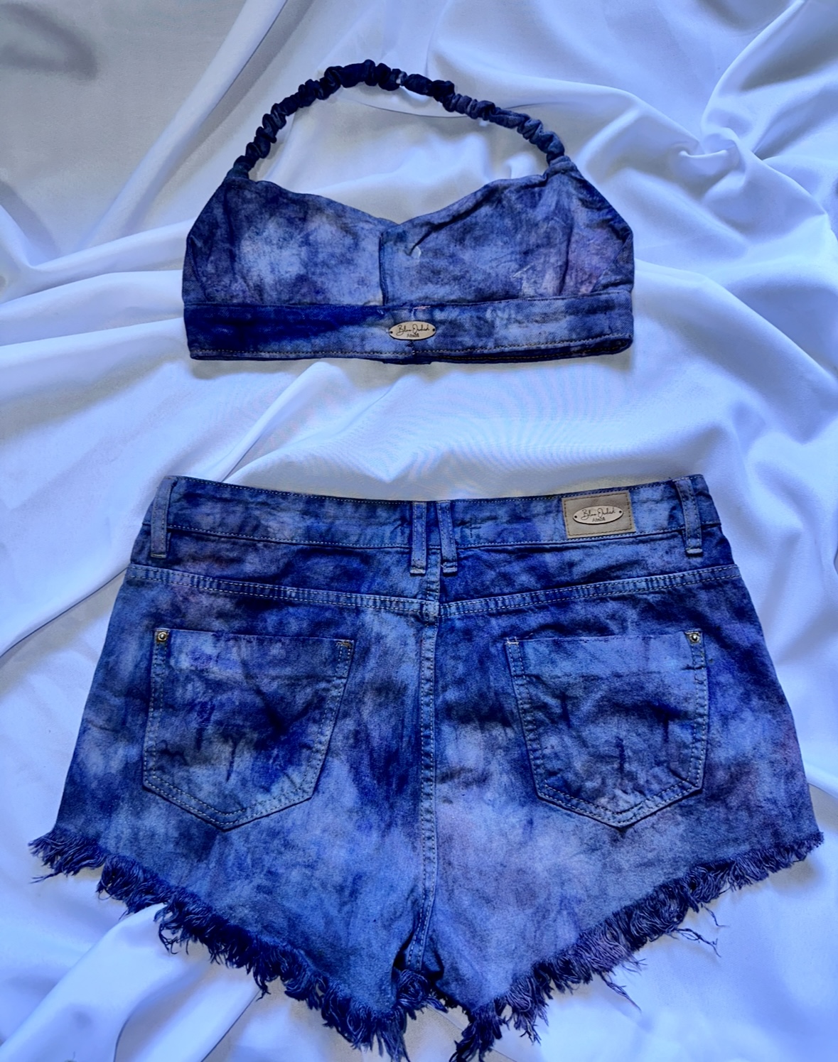 Conjunto TieDye, Top e Short. Tiedye em tons de azul, lilás e rosa com aplicação de pedras.