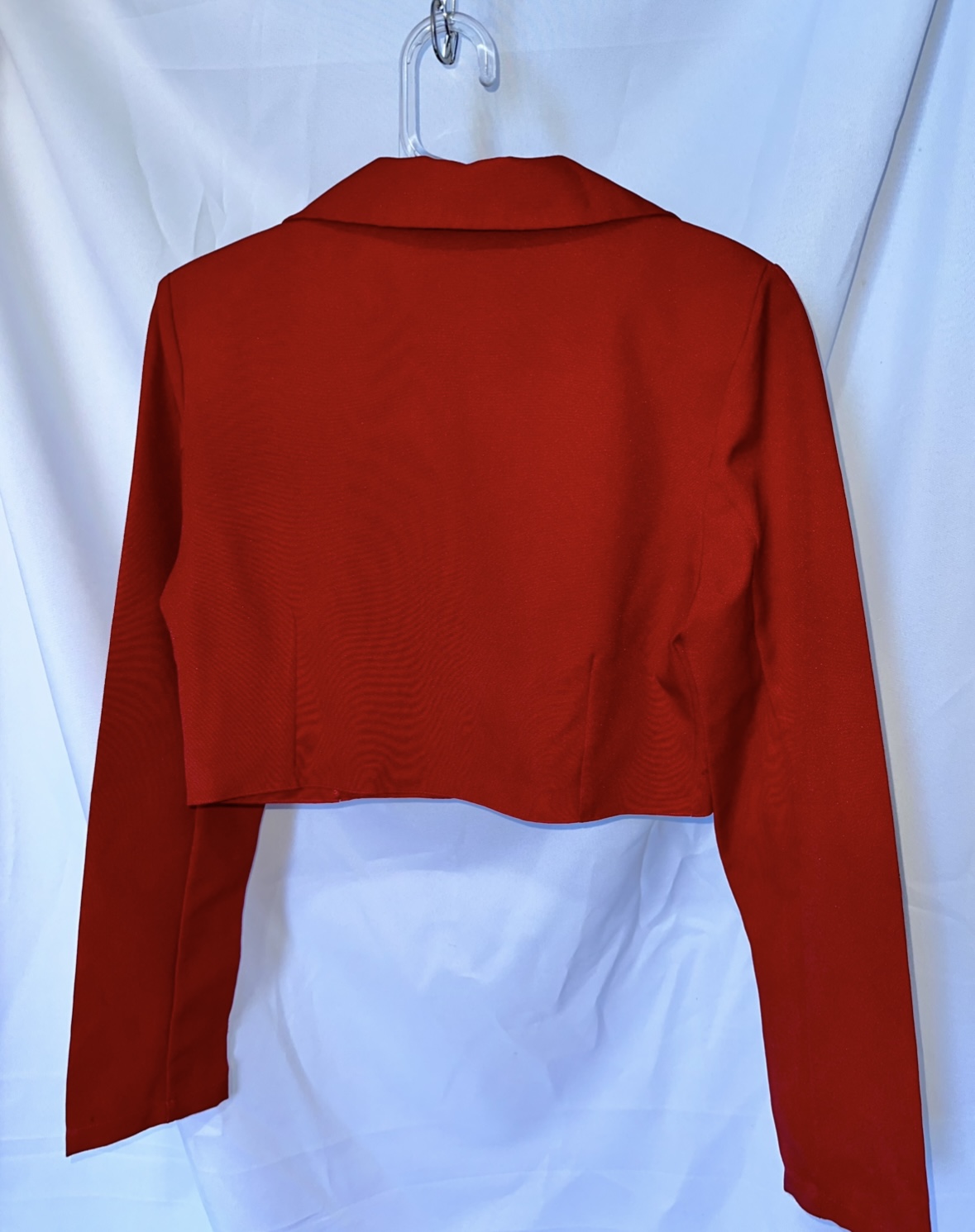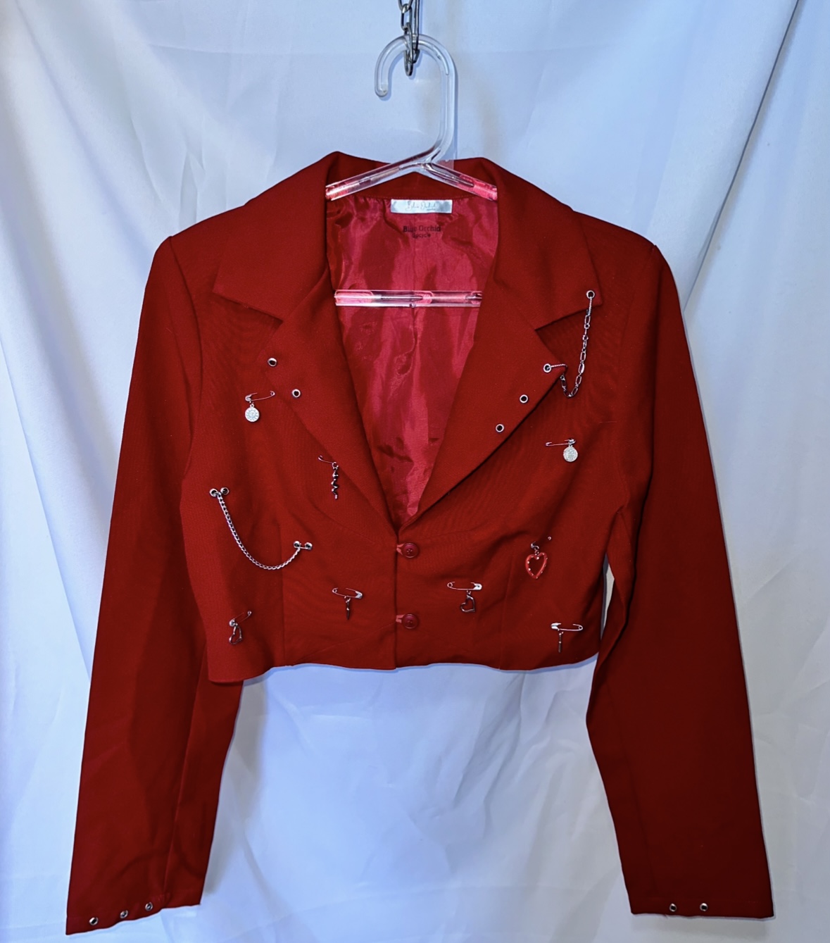 Blazer Cropped, manga comprida customizado com aplicação de pingentes, ilhós e correntes.